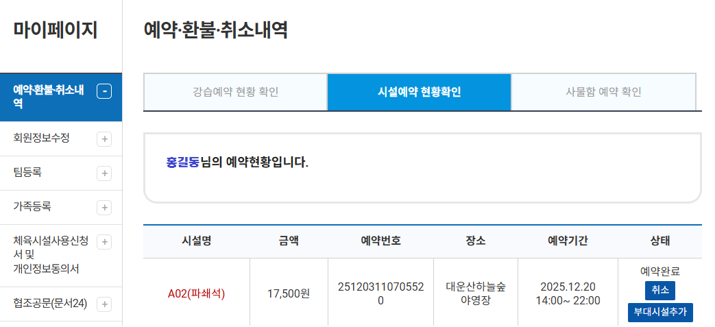 ▣ 예약내역 확인 마이페이지-시설예약 현황 확인에서 예약내역 확인 및 취소 가능