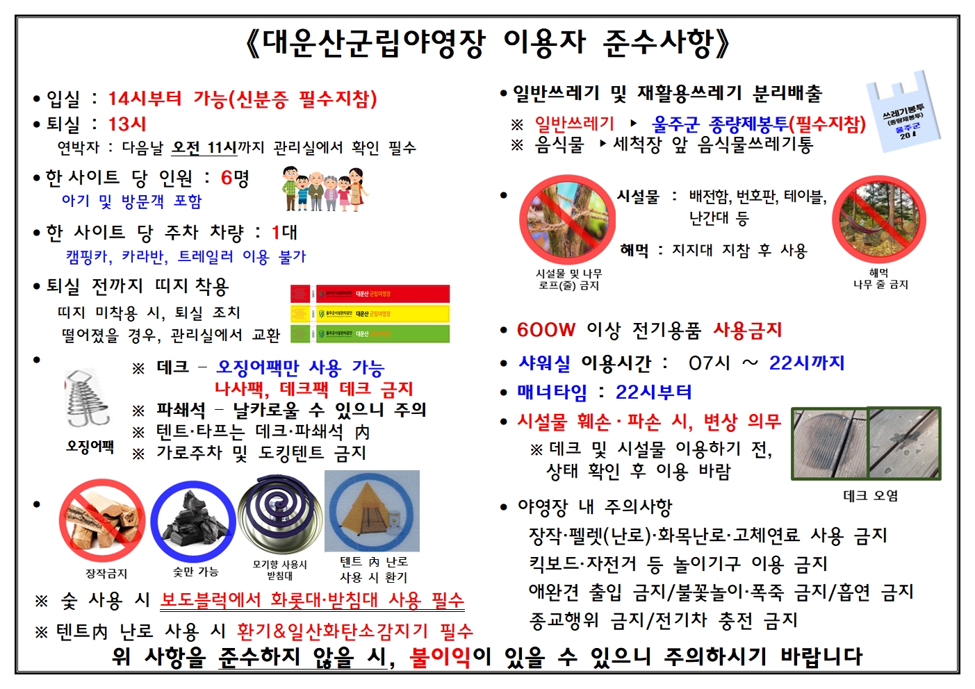 ▣ 이용 유의사항 • 입실 전 예약자 본인 확인(신분증 필수 지참) 및 이용규정 안내 • 예약일 14시부터 입실하여 다음날 13시까지 퇴실 • 사이트당 최대 6명 이용(영유아·방문객 포함) • 캠핑카·카라반·트레일러 이용 불가 • 미성년자 단독 이용 불가